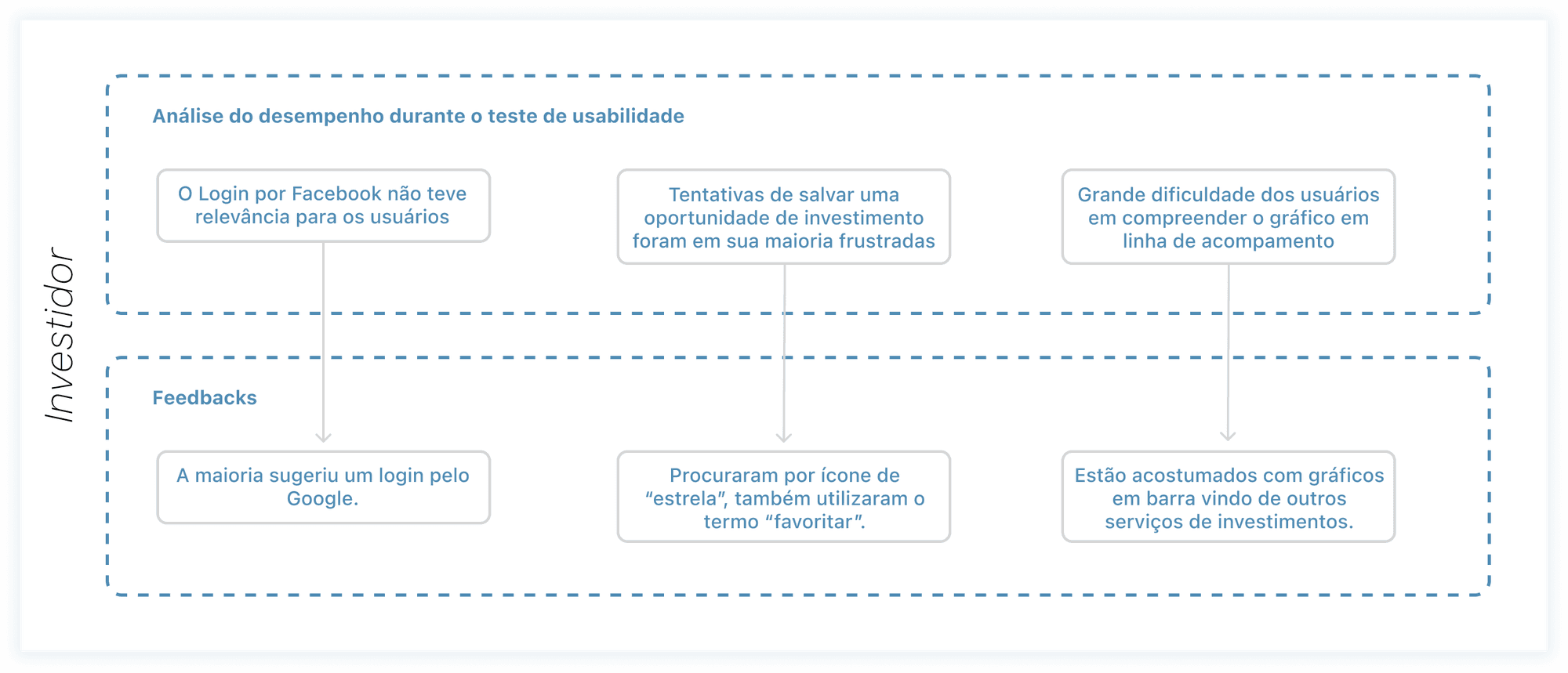 Como o projeto se movia na dinâmica da consultoria, não havia a necessidade de entregas rápidas e uma metodologia ágil. Então seguimos na construção de um fluxo navegável inteiriço para que pudéssemos testar as funcionalidades em uma só entrevista e isso levando em conta um impeditivo que encontramos na hora de recrutar personas investidoras. No perfil investidor se encaixam pessoas do perfil arrojado, que investem em renda variável e normalmente tem grande poder monetário. Para essas pessoas, tempo é dinheiro e um presente/incentivo para contribuir com uma pesquisa não era tão convidativo. Então pela escassez de participantes, optamos por gerar um roteiro completo que fosse testado de uma vez só com esses participantes.