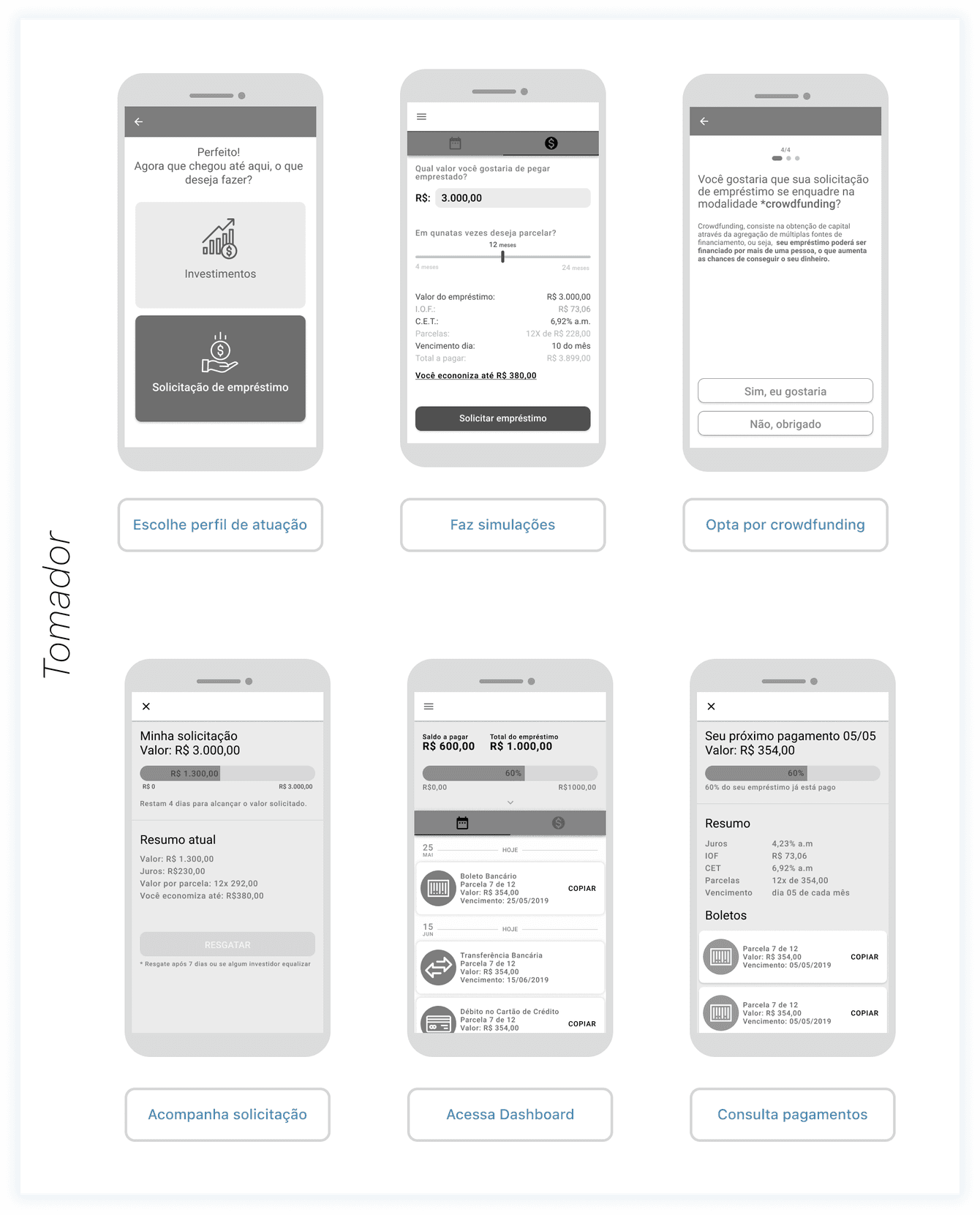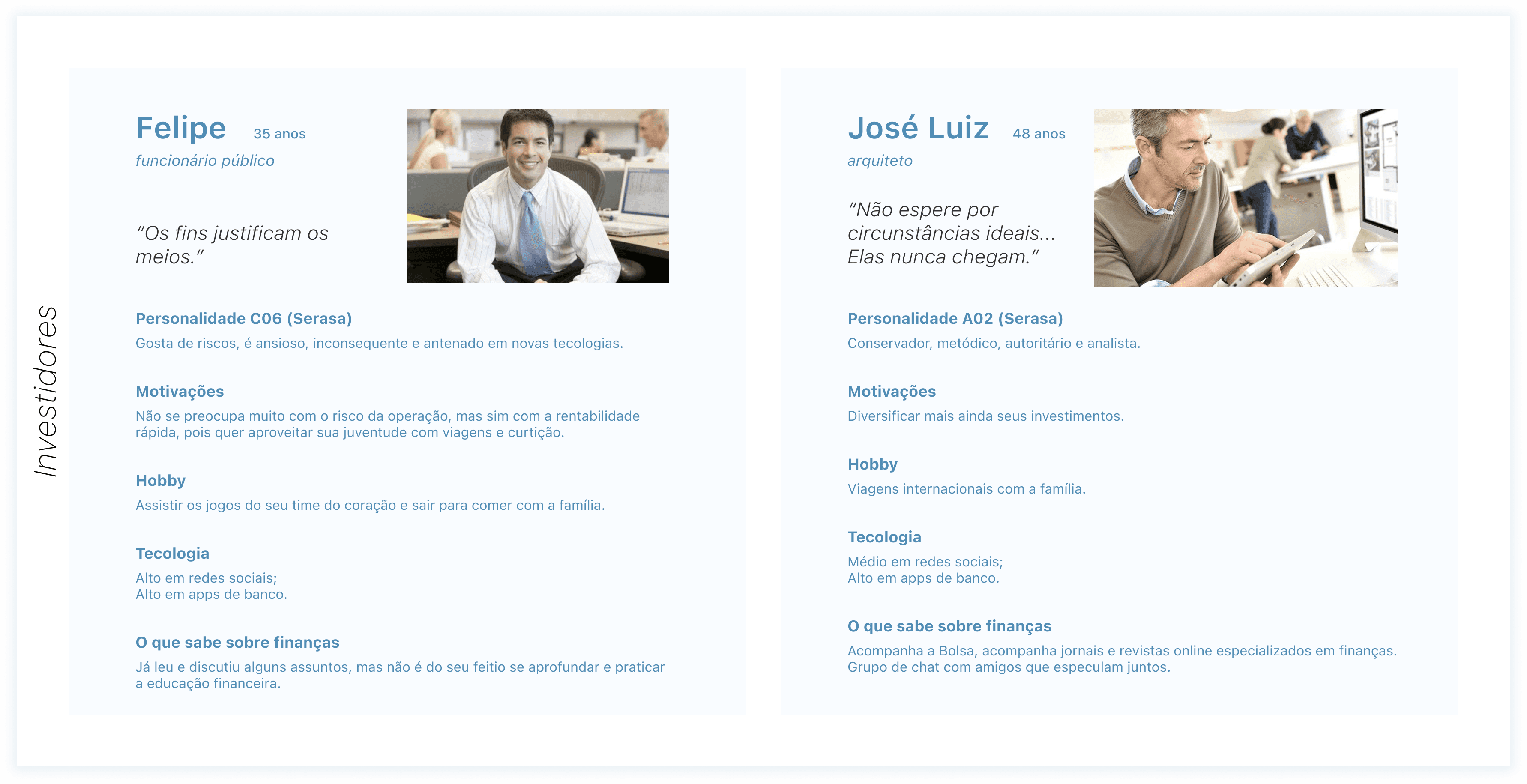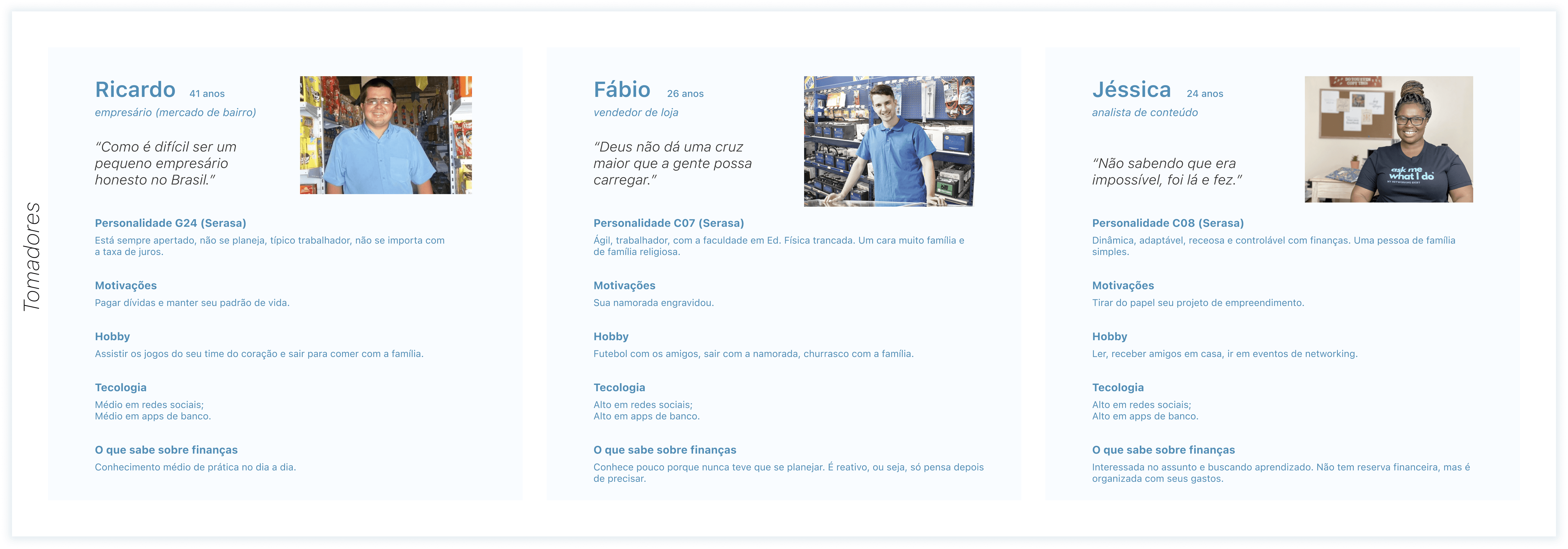 Assim identificamos o perfil dos nossos usuários tomadores (quem toma o dinheiro emprestado) e dos nossos usuários investidores (quem empresta o dinheiro), separando esses perfis em usuários extremos e gerando 5 personas principais para o produto.