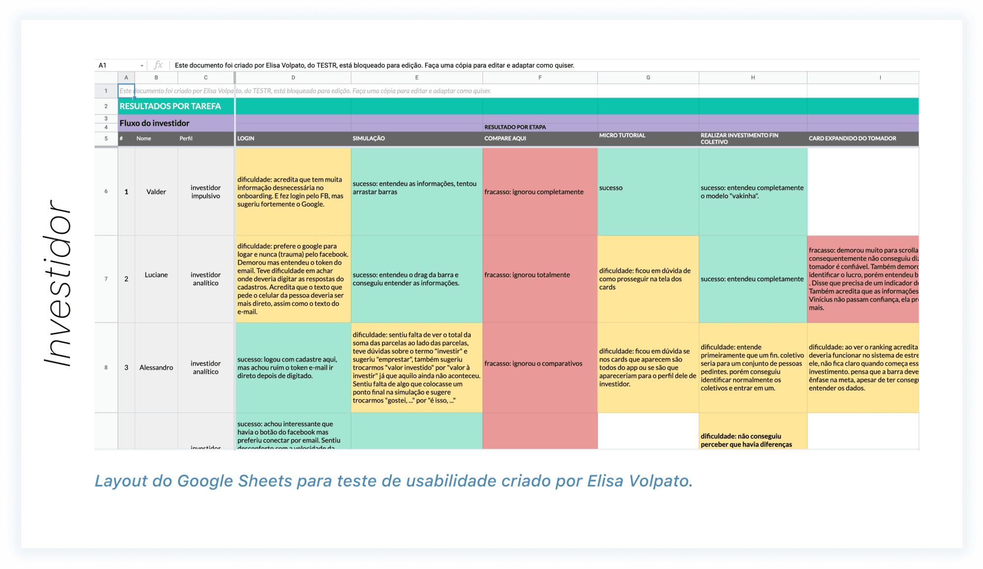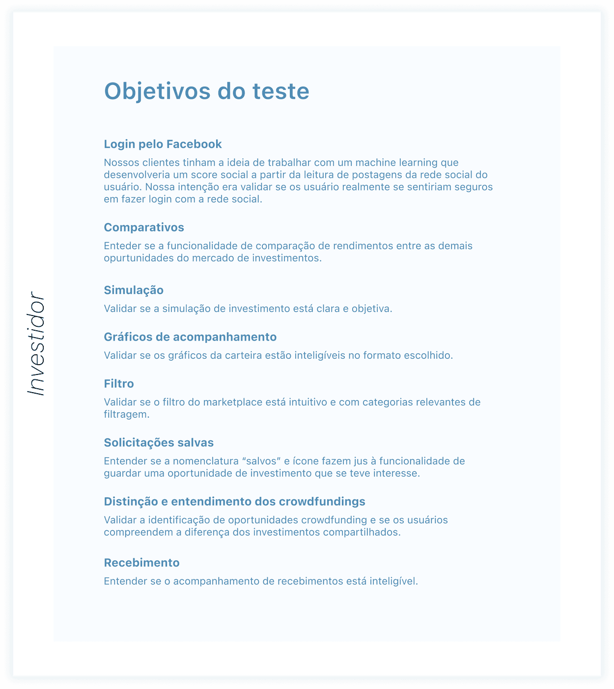 Para executarmos nosso teste de usabilidade, nós recrutamos 8 tomadores e 5 investidores, criamos um roteiro inteiriço, que como citei acima, incluía um caminho por todas as funcionalidades a serem testadas. A seguir mostro um pouco do planejamento dos testes desenvolvidos para essa etapa e também apresentarei a metodologia utilizada na compilação.