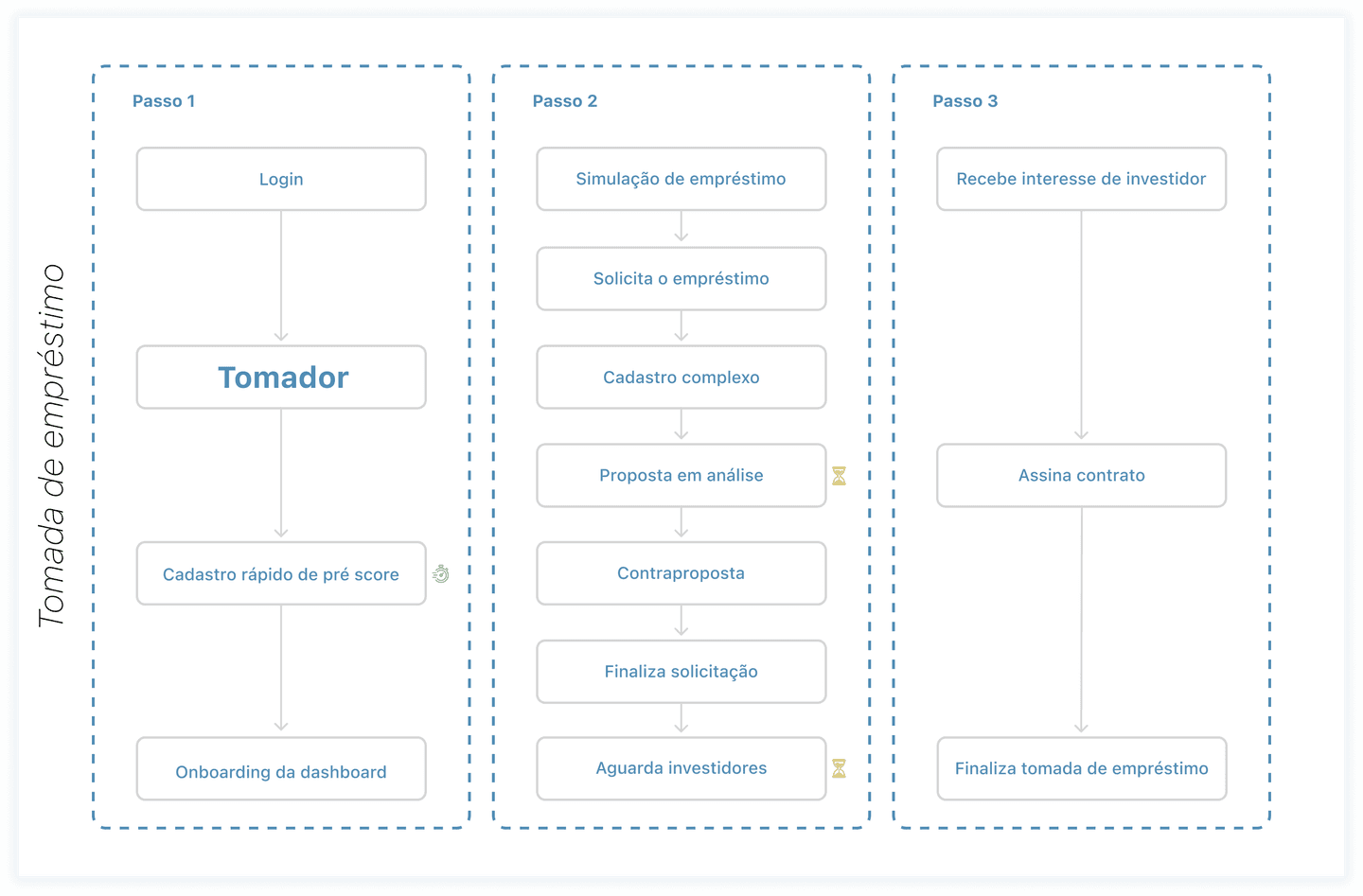 Ao pensarmos o fluxograma do investidor, nós identificamos uma oportunidade muito interessante para o negócio sobre a possibilidade de existirem empréstimos crowdfundeados, ou seja, que mais de um investidor pudesse emprestar dinheiro para o mesmo tomador. E então levamos essa ideia para o projeto com o intuito de validar nas entrevistas de testes de usabilidade.