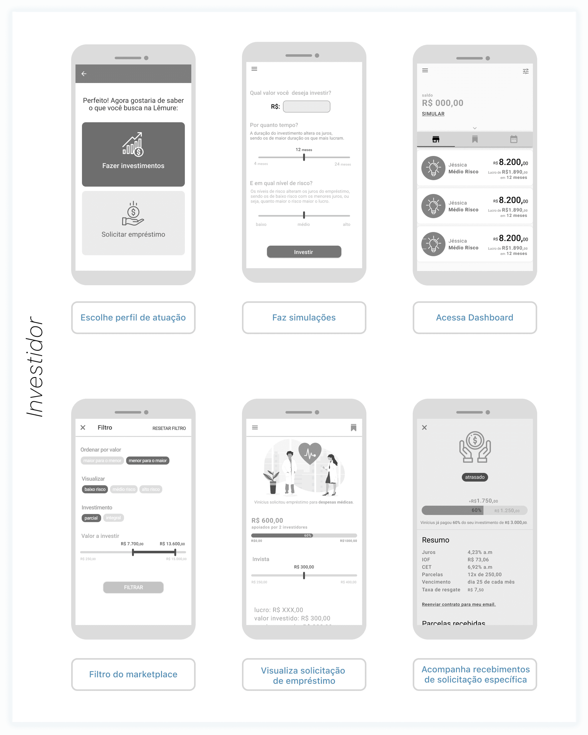 E aqui estão alguns wireframes do fluxo dos investidores, também foram feitas de forma colaborativa por mim e pelo Leandro no Figma.