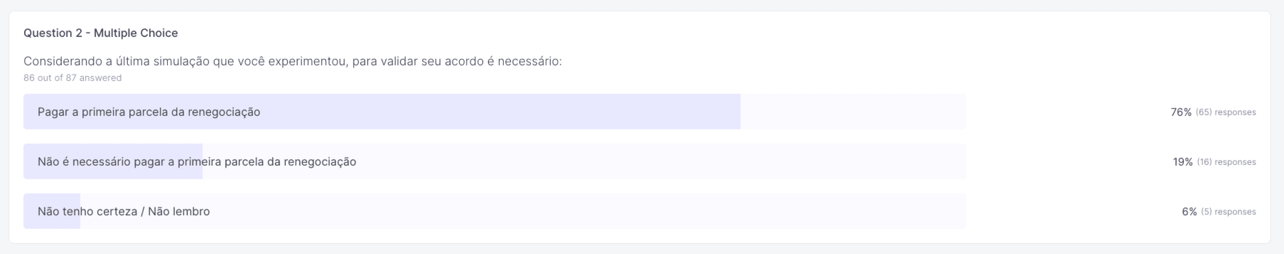 Nossa pesquisa foi enviada para duas bases diferentes: usuários que já renegociaram via app e usuários que estão inadimplentes. A partir dos resultados coletados, pudemos ter um maior esclarecimento sobre quais eram os gaps de interface no nosso fluxo, assim como também pudemos coletar muitos feedbacks sobre as regras de negócio do nosso produto.