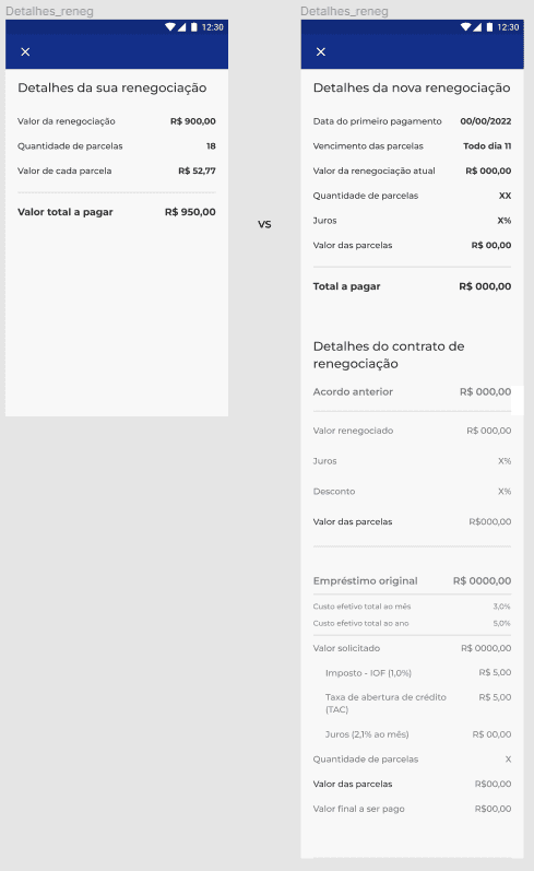 To enhance transparency, I opted to redesign the renegotiation details screen. This screen, which was previously only accessible within the renegotiation request flow, was also made available for users with active renegotiations. Prior to this change, users were required to consult their contracts for detailed information about their renegotiations.