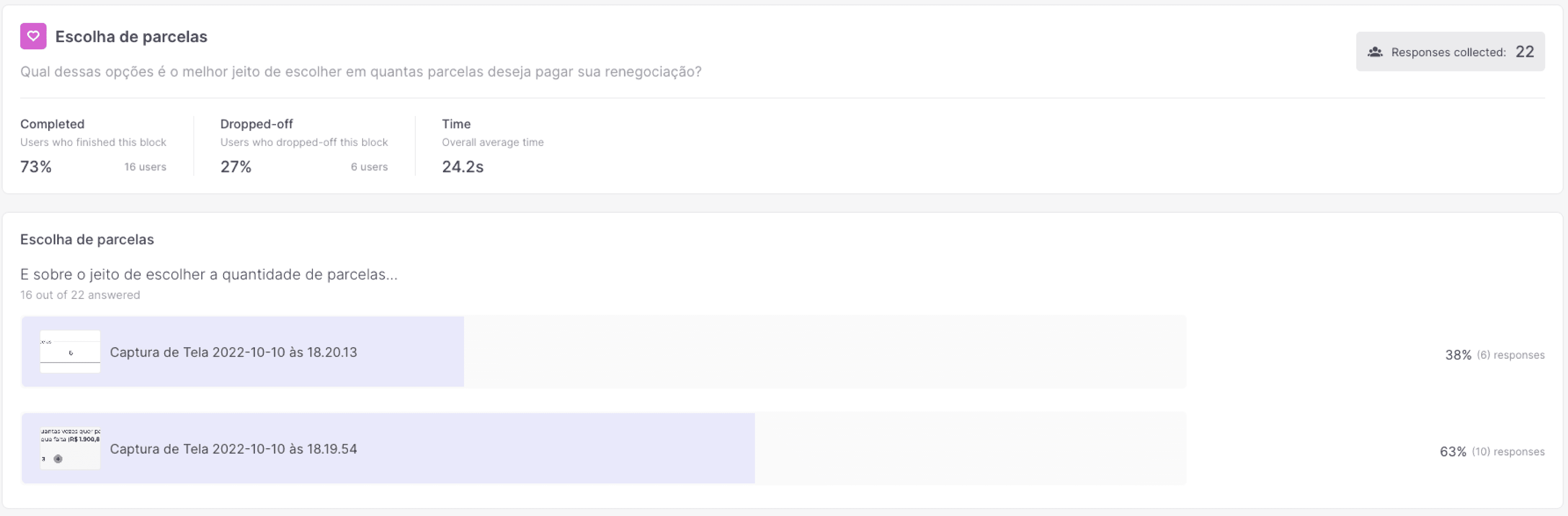 This research consisted of an asynchronous usability test and a questionnaire about the experience with the flow used in the test. And as we can see from the result above, 76% of the participating users understood the message we wanted to convey that it was indeed necessary to pay the first installment of the renegotiation to complete the contracting process. At the same time, in the image below, we can see users choosing between two types of components that allow them to choose the desired number of installments, being a more exploratory part of the questionnaire.