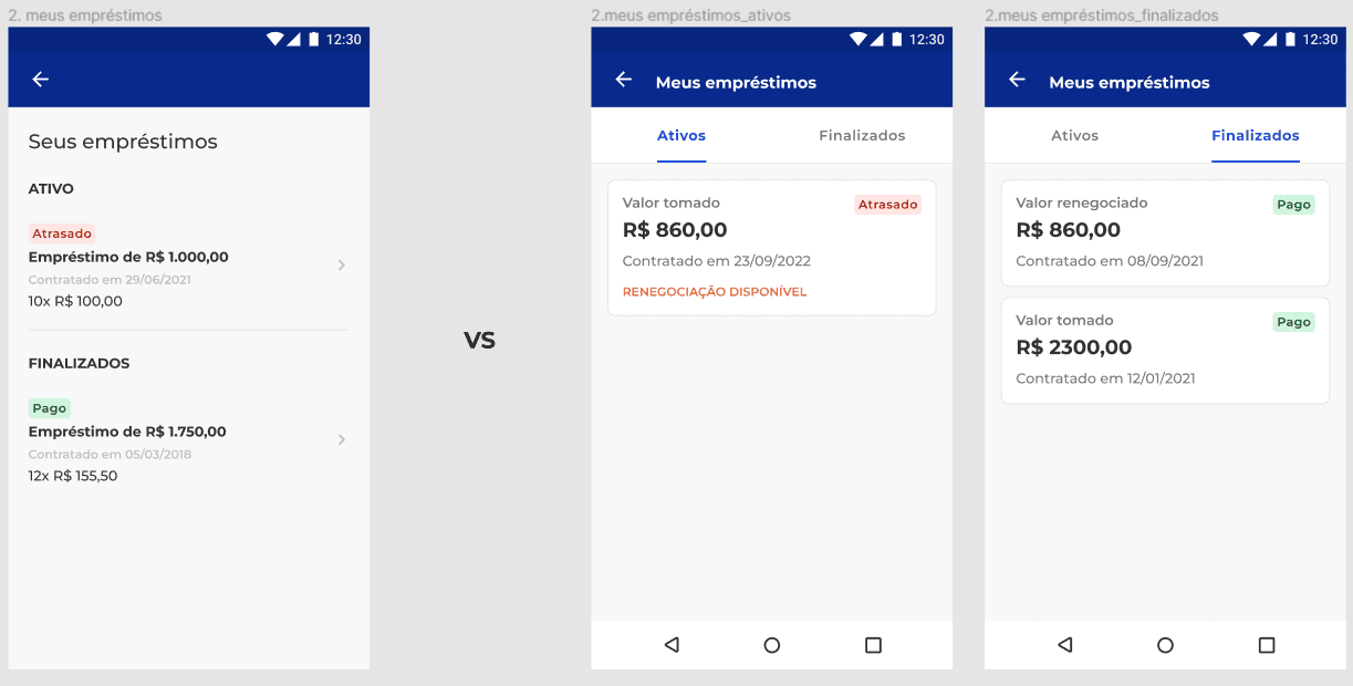 Clear Renegotiation Availability: A badge was added to each card explicitly indicating the availability of renegotiation options for that specific loan. This clear visual indicator eliminates any ambiguity and guides users directly to the action they need to take.