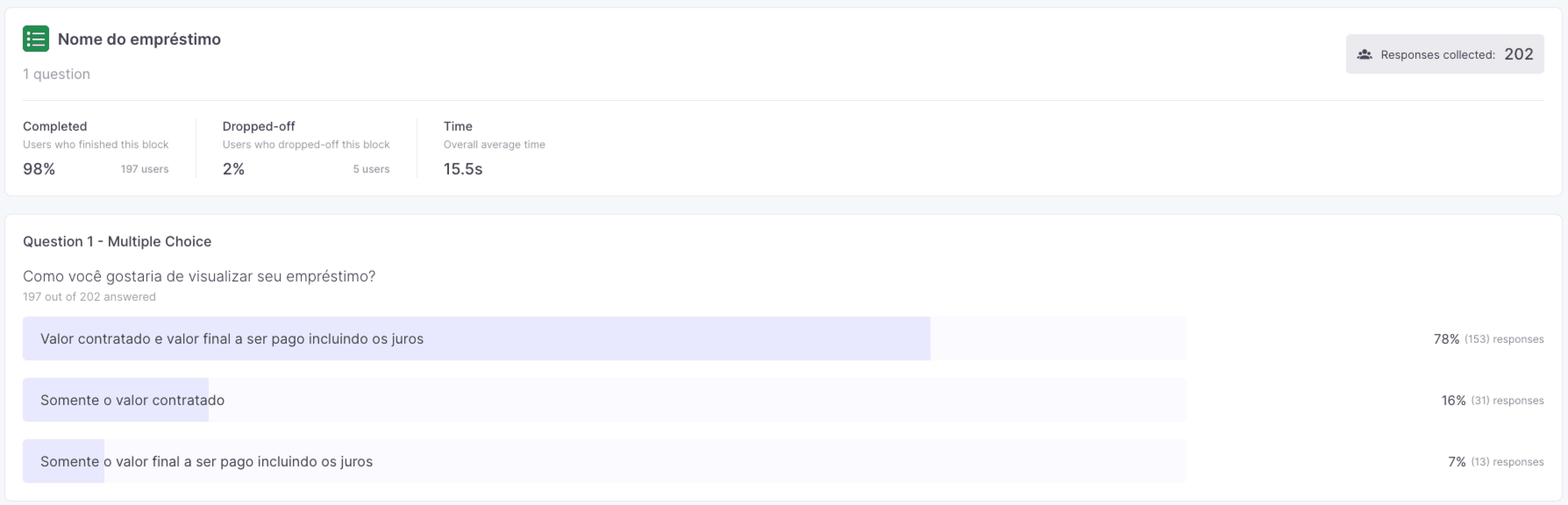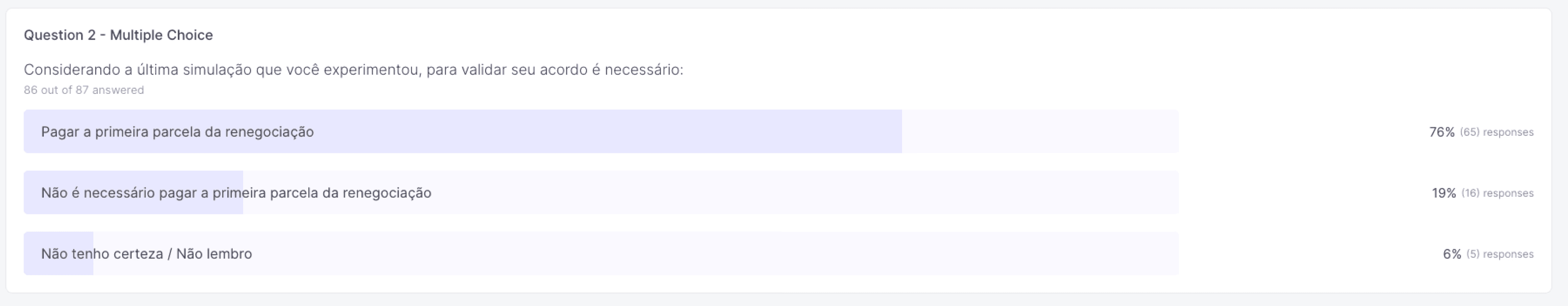 Our survey was sent to two different bases: users who have already renegotiated via the app and users who are in arrears. From the results collected, we were able to gain a better understanding of the interface gaps in our flow, as well as collect a lot of feedback on the business rules of our product.